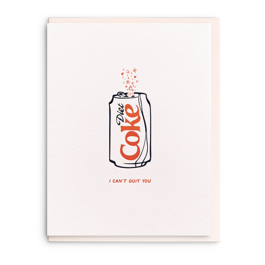 This clever card playfully compares your devotion to a Diet Coke obsession because let's face it, true love is just as irresistible. Hand-illustrated and letterpress printed on luxuriously plush paper, it's a modern love note that's equal parts witty and sweet, perfect for anyone who appreciates a good pop culture reference with their romance.