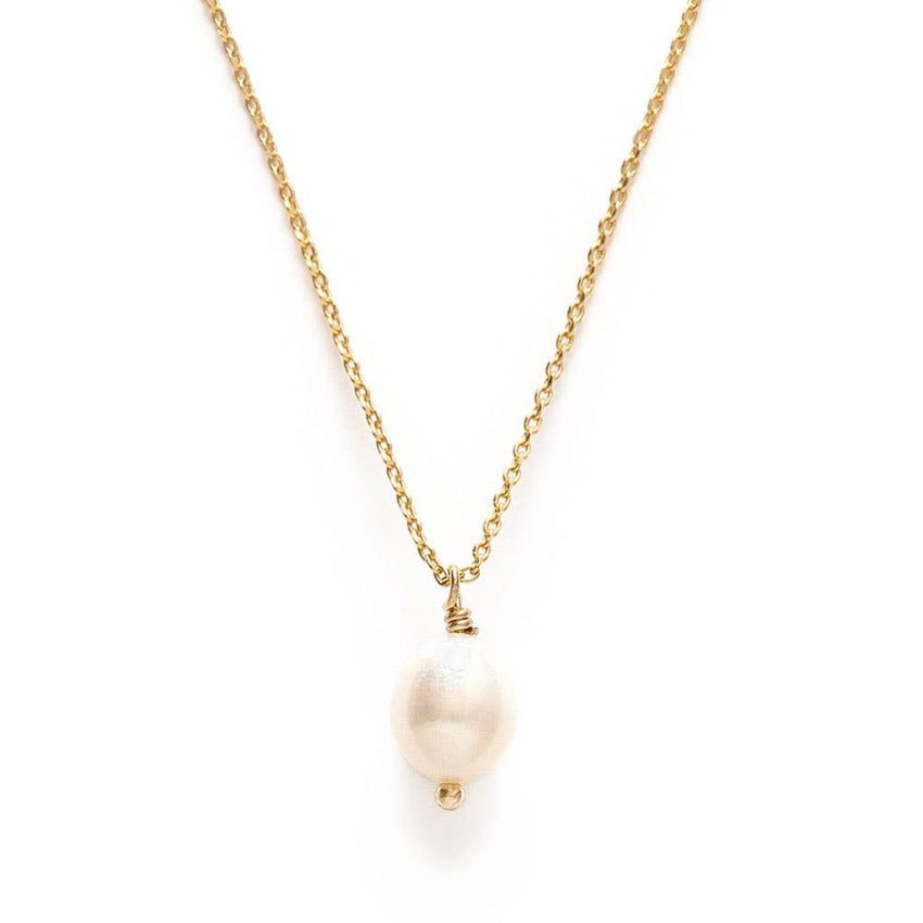 Celebrate elegant simplicity with this fresh water pearl necklace. This refined piece features a genuine freshwater pearl suspended on a delicate 14k gold plated brass chain that measures 20 inches adjustable chain, giving you the flexibility to wear it short like a choker or layered with other necklaces. Each pearl has its own unique organic shape, offering timeless charm and natural variation. Designed and assembled by hand in Amano Studio’s Sonoma, California workshop, this necklace pairs beautifully with both everyday outfits and special occasion looks. A classic and versatile accessory, it makes a thoughtful gift for birthdays, anniversaries, or any moment worth celebrating.