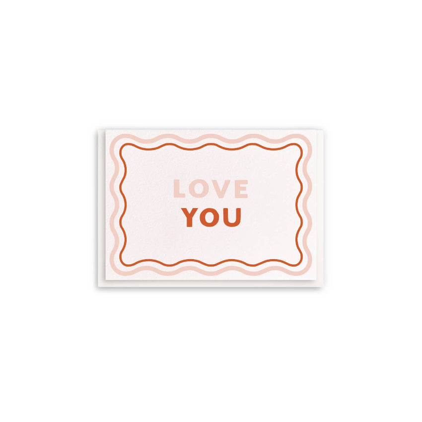 Sometimes the sweetest sentiments come in the smallest packages. This adorable mini card features a soft blush pink background with a playful coral wavy border that practically radiates warmth and affection. Tuck it into a bouquet, attach it to a gift, or slip it into a lunchbox to remind someone special just how much they're loved.