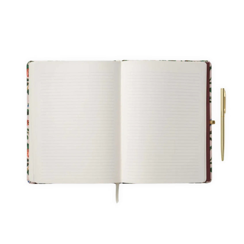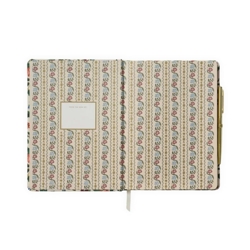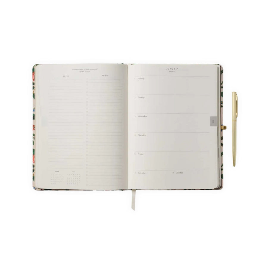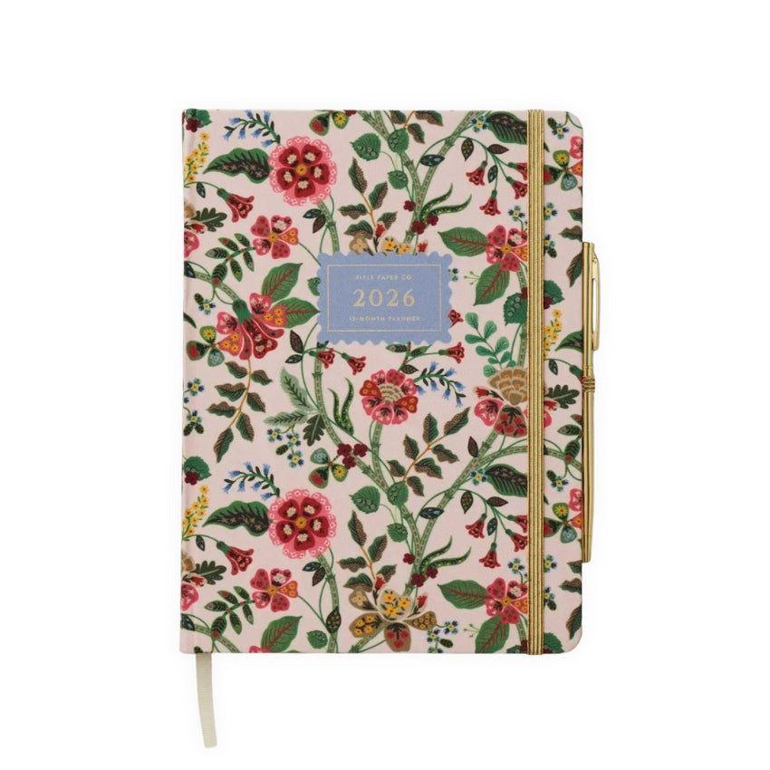 The Gracie Hardcover Planner with Pen by Rifle Paper Co. fuses floral elegance with practical planning tools. Its cover is wrapped in book cloth printed with floral artwork and includes a foil-stamped year with an elastic band closure, paired with a matching gold pen.