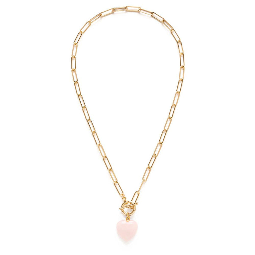 This elegant necklace features a polished rose quartz heart pendant that symbolizes love and compassion, suspended from a substantial gold plated brass toggle chain that sits comfortably around the neckline. The soft pink hues of the genuine rose quartz stone bring a gentle, feminine touch, while the sturdy toggle closure adds stylish vintage inspired detail and ease of wear. Designed and assembled by hand in Amano Studio’s Sonoma, California workshop, this piece combines artisan craftsmanship with wearable elegance. A thoughtful choice for anniversaries, Valentine’s Day, birthdays, or everyday expressions of affection and connection.
