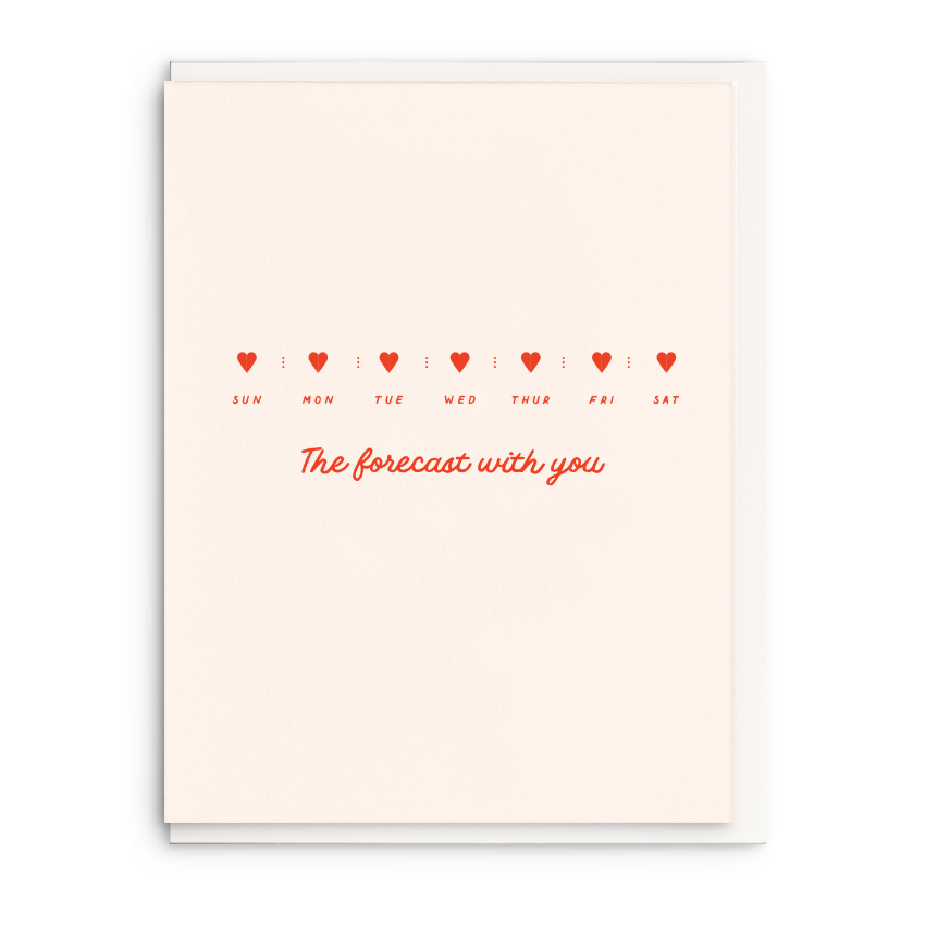 Check the forecast: it's hearts all week long! This adorable card features a week-long love forecast that predicts nothing but affection from Monday through Sunday. Perfect for the weather enthusiast in your life or anyone who deserves to know that your love is as reliable as the sunrise, this charming design proves that when it comes to romance, the outlook is always sunny.